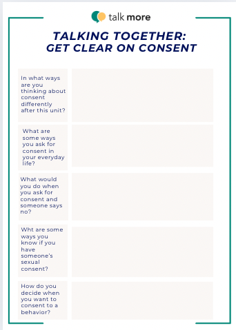 Now is the time to reflect on this Consent unit with your grownup. Click on the worksheet to the right, and download the Reflection Worksheet linked there. Write down your thoughts for each question; take about 10 minutes. When your both finished: